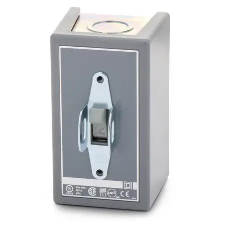 Square D 2510K motor starting switches provide compact manual On Off control of single or three phase motors or resistance heating loads up to 600 VAC, where overload protection is not required or provided separately. Open type fits industry standard single-gang switch boxes for direct mounting in a wall or machine using any standard cover plate with a standard single cutout. Pilot light option is available. A variety of enclosures are available. Units are UL Recognized and CSA Certified for global applications. The maximum operational voltage is 600 VAC and 250 VDC. This three pole switch is rated for 2 HP at 115VAC, 7.5 HP at 230VAC, 10 HP at 460VAC, 10 HP at 600VAC single phase, 1 HP at 90 VDC, 2 HP at 115 VDC and 1.5 HP at 230 VDC and 30A continuous. The screw clamp terminals will accept 14 to 10 AWG copper wire. This switch has no pilot light indicator. This manual motor switch is not supplied with an enclosure. This switch is 4.13 inches tall, 1.69 inches wide and 2.34 inches deep. It weighs 0.35 lb. This device is UL Listed and CSA certified.