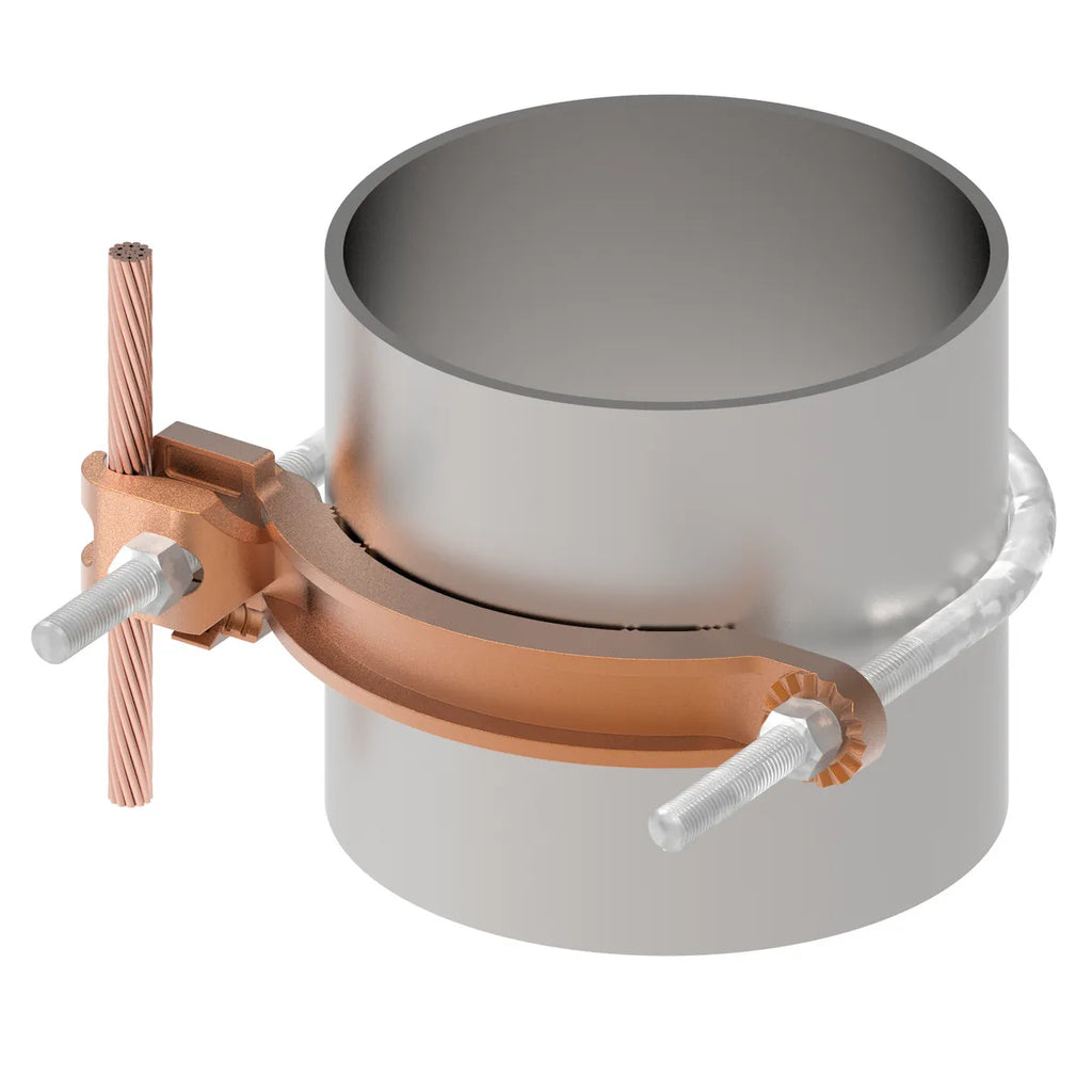 Mechanical Grounding Connector, Conductor to Water Pipe, 4-4/0 AWG, 6" Pipe, 3/8" Stud. Galvanized Steel Hardware.