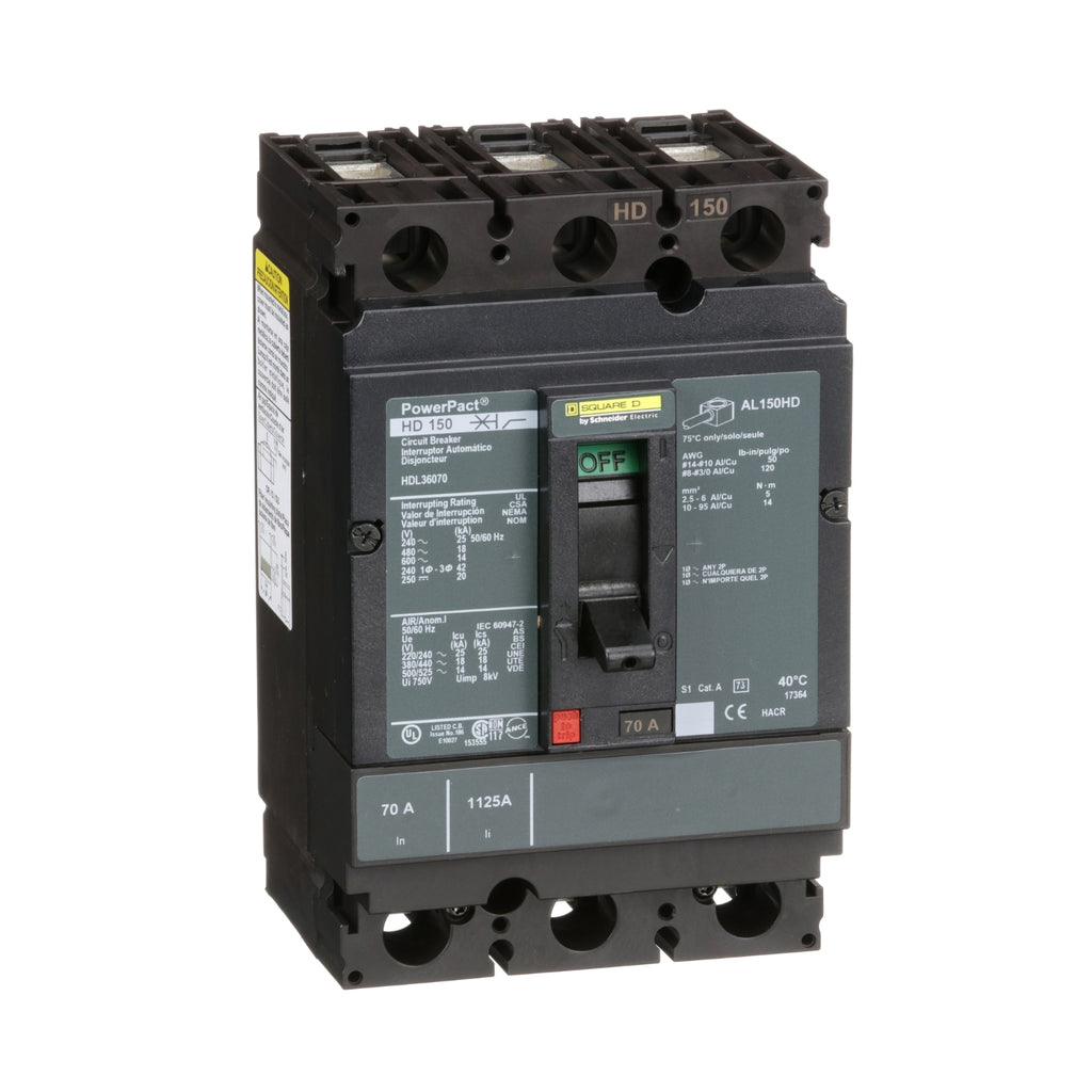 HDL36070 - Schneider Electric - Feed-Thru 70 Amp 3 Pole 600 Volt Square D Molded Case Circuit Breaker